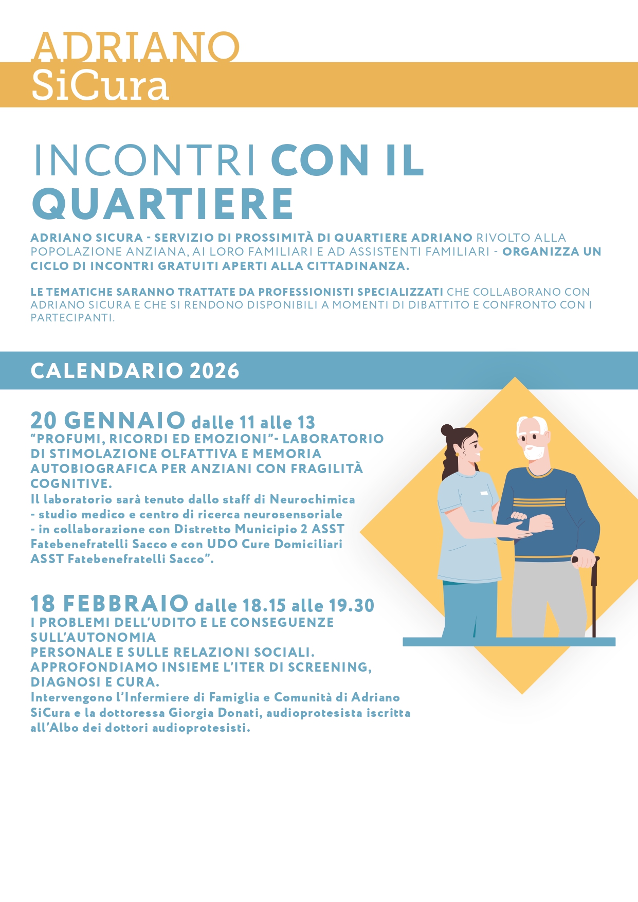 Adriano SiCura inaugura il 2026 con un ricco calendario di incontri gratuiti dedicati alla popolazione anziana del quartiere Adriano di Milano, ai loro familiari e agli assistenti familiari. Gli appuntamenti, aperti alla cittadinanza, vogliono promuovere benessere, prevenzione e momenti di confronto su temi di grande interesse per la terza età.