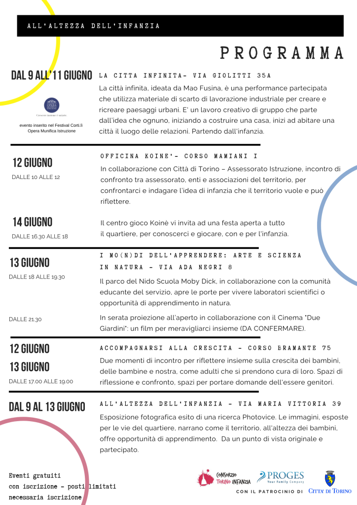 Con questa idea, dal 9 al 13 giugno 2023, i servizi educativi di Torino gestiti da Proges e Consorzio Torino Infanzia (di cui la cooperativa Proges è socia), in dialogo e con il patrocinio della Città di Torino – Assessorato all’Istruzione, promuovono un insieme di eventi rivolti ai bambini e alle bambine, alle famiglie e alla cittadinanza, con uno sguardo di ricerca intorno ai temi di Cura e Apprendimento.