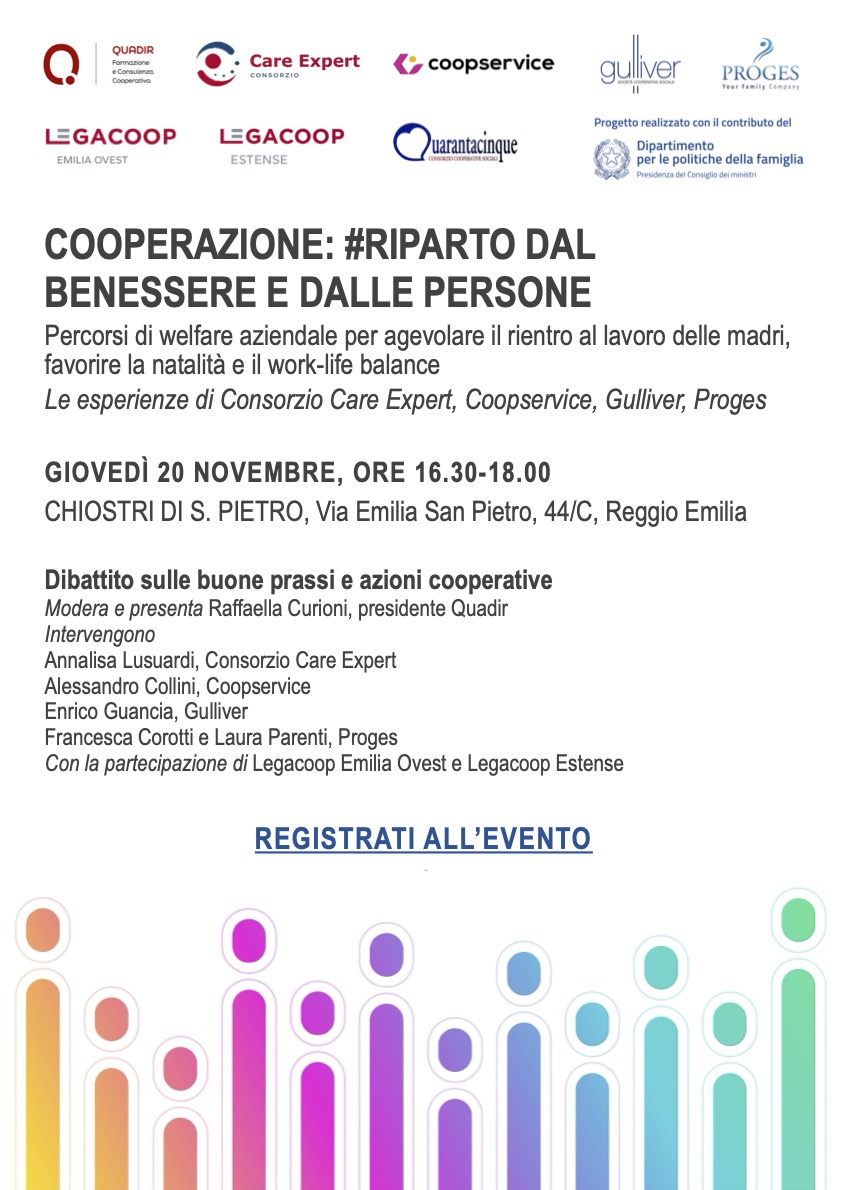 Giovedì un’iniziativa ai Chiostri di S. Pietro sulle esperienze di Proges, Consorzio Care Expert, Coopservice, Gulliver nell’ambito della partecipazione all’Avviso ministeriale che sostiene percorsi di welfare aziendale per agevolare il rientro al lavoro delle madri, favorire la natalità e il work-life balance