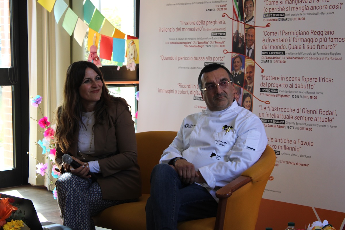 “Quello con lo chef Bergonzi, che ringraziamo di cuore per essere qui, è il terzo appuntamento della rassegna 2026 ‘Storie che si incontrano – Le voci della città nei luoghi della cura‘ promossa dalla cooperativa Proges. Dopo l’anteprima con il procuratore aggiunto di Bologna Lucia Russo, ci siamo confrontati nella CRA Alberi con il direttore della Gazzetta di Parma Claudio Rinaldi e nella CRA Sidoli con il sindaco di Parma Michele Guerra. E’ molto bello che personalità e voci autorevoli della città hanno accettato di mettersi in gioco nelle case degli anziani, nei gruppi appartamento per persone con disabilità e nelle strutture della salute mentale” ha introdotto Annalisa Pelacci, presidente di Proges, a cui sono seguiti i saluti della coordinatrice della struttura Giorgia Panciroli Morini e dell’assessora alle politiche sociali del Sorbolo Mezzani Sandra Boriani.