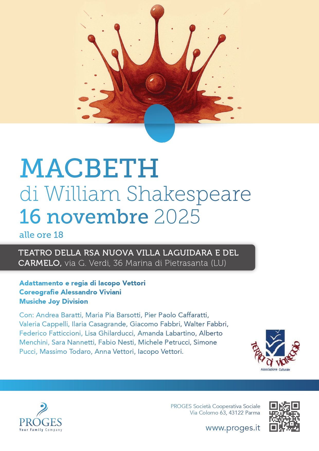 Il 16 novembre 2025, alle ore 18, andrà in scena Macbeth di William Shakespeare presso il Teatro della RSA Nuova Villa Laguidara e del Carmelo, in via G. Verdi 36, Marina di Pietrasanta (LU).