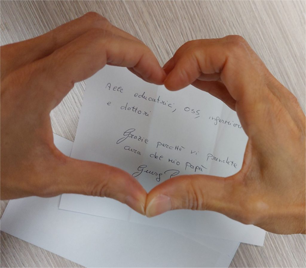 «Non sono una figlia della tecnologia» racconta Laura Catena, educatrice professionale socio-sanitaria. «Sono affezionata alla carta e alla penna, scrivo ancora le cartoline. Mi piace l’idea di fermarsi, riflettere, aspettare. È qualcosa di intimo, che puoi conservare in un libro o nel cassetto del comodino. Così abbiamo pensato: perché non proporre agli ospiti di scrivere una lettera di ringraziamento o d’amore, a chiunque volessero? Anche solo al vicino di stanza.»