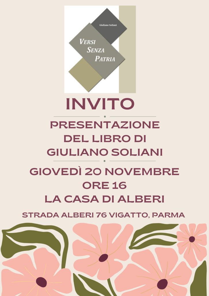 Giovedì 20 novembre, alle ore 16, Giuliano Soliani, ospite della CRA La Casa di Alberi di Vigatto, presenterà la sua prima raccolta di liriche: “Versi senza patria”.