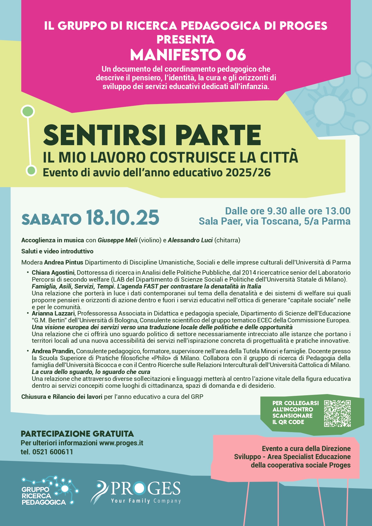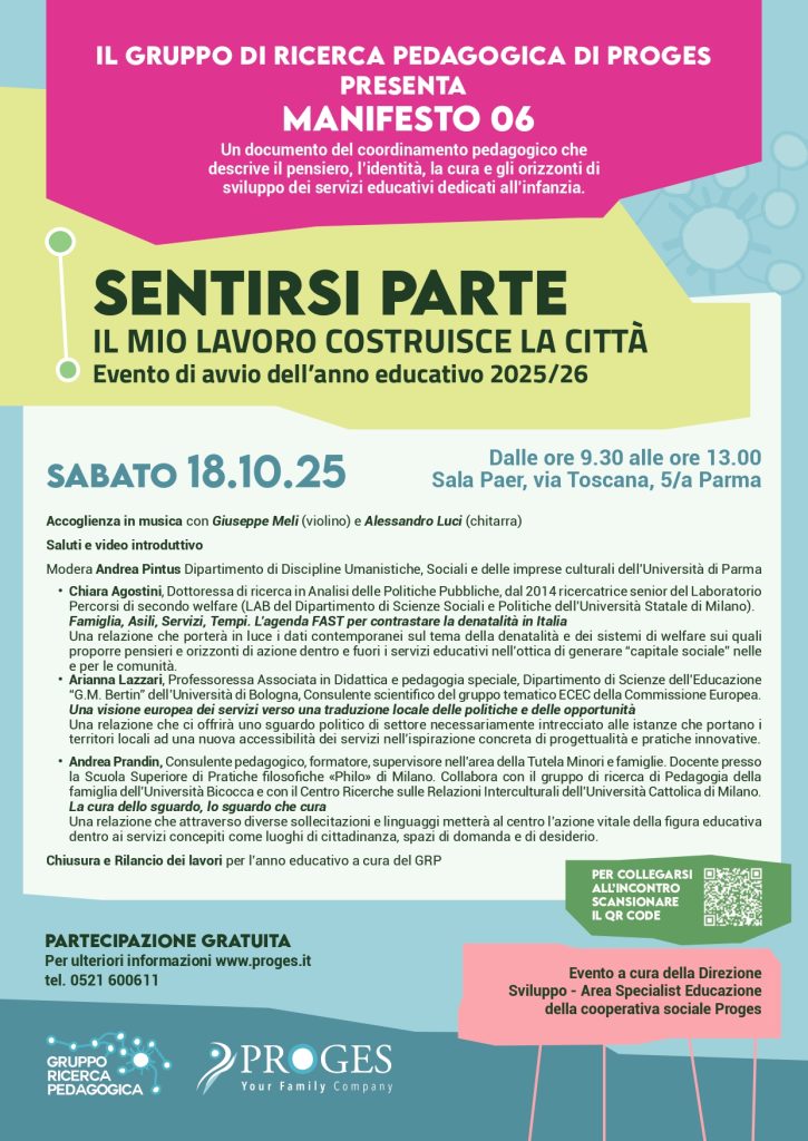 Sabato 18 ottobre 2025, dalle 9.30 alle 13.00, presso la Sala Paer di Parma (via Toscana 5/a), si terrà l’evento di apertura dell’anno educativo 2025/26 promosso dal Gruppo di Ricerca Pedagogica di Proges. L’incontro, dal titolo “Sentirsi parte. Il mio lavoro costruisce la città”, sarà l’occasione per presentare il Manifesto 06, un documento di coordinamento pedagogico che definisce il pensiero, l’identità, la cura e gli orizzonti di sviluppo dei servizi educativi dedicati all’infanzia.