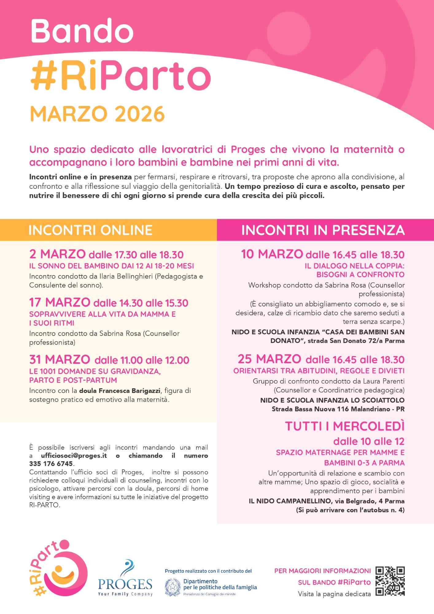 Nel mese di marzo 2026 sono molti gli appuntamenti in programma con #RiParto, il progetto dedicato alle lavoratrici di Proges che stanno vivendo la maternità o accompagnano i propri bambini e bambine nei primi anni di vita. Un percorso pensato come tempo prezioso di ascolto e confronto, che alterna incontri online e in presenza per offrire strumenti concreti, sostegno emotivo e occasioni di relazione.