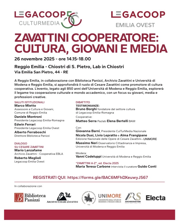 Il convegno nazionale “Zavattini cooperatore: cultura, giovani e media”, promosso da CulTurMedia e Legacoop Emilia Ovest in collaborazione con Biblioteca Panizzi, Archivio Zavattini, Università di Modena e Reggio Emilia, ArcheoSistemi ed Electa, si terrà mercoledì 26 novembre a partire dalle 14.15 presso i Chiostri di San Pietro a Reggio Emilia. L’evento si inserisce anche nel programma delle celebrazioni per gli 850 anni dell’Università di Modena e Reggio Emilia, rafforzando il dialogo tra cooperazione culturale e mondo accademico.
